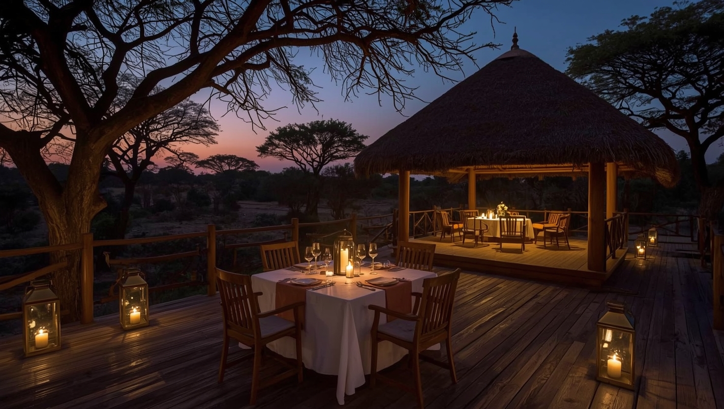 A candlelit table set in a private clearing on the property. Five courses by the head chef, brass hurricane lanterns, and a Maasai watchman until you are ready to walk back.