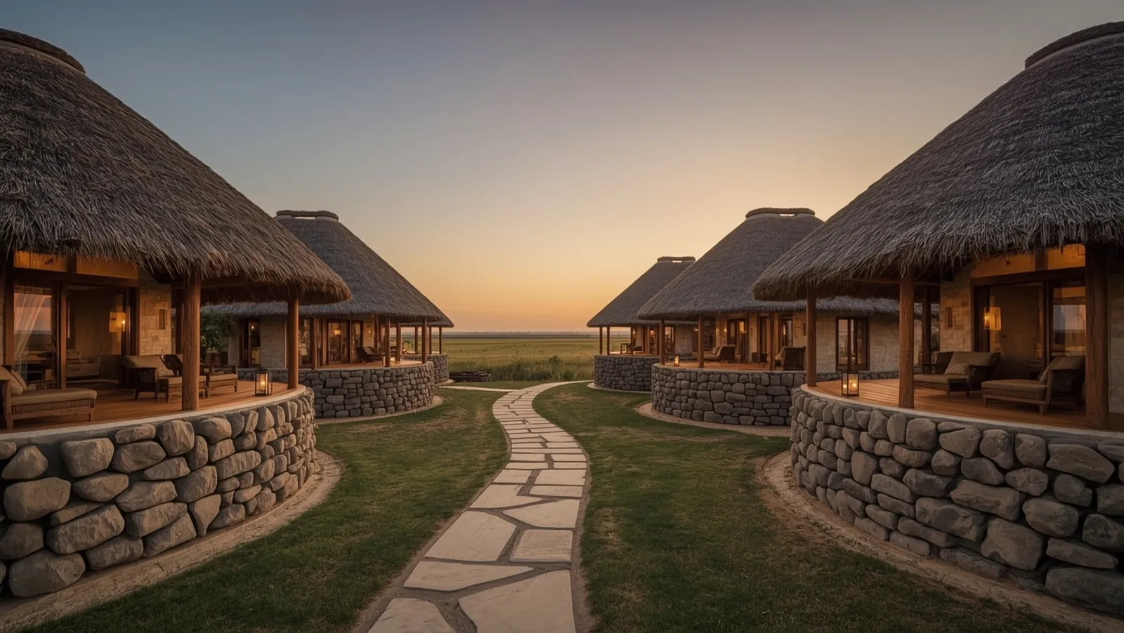 All five room types share the same architect, the same palette, and the same hand-built construction. Stone and thatch outside, hardwood and brass inside.